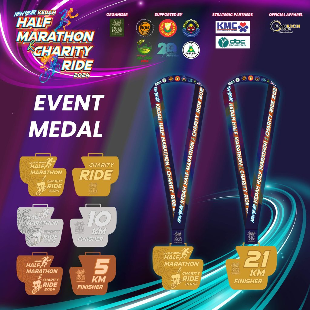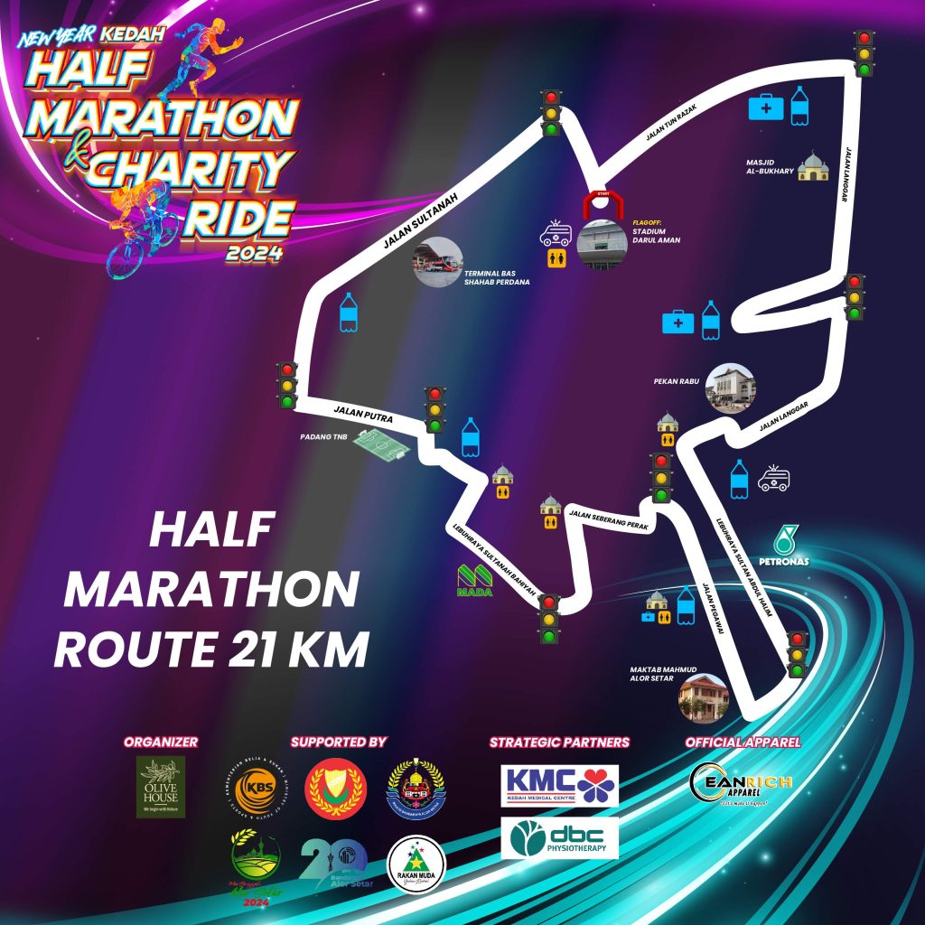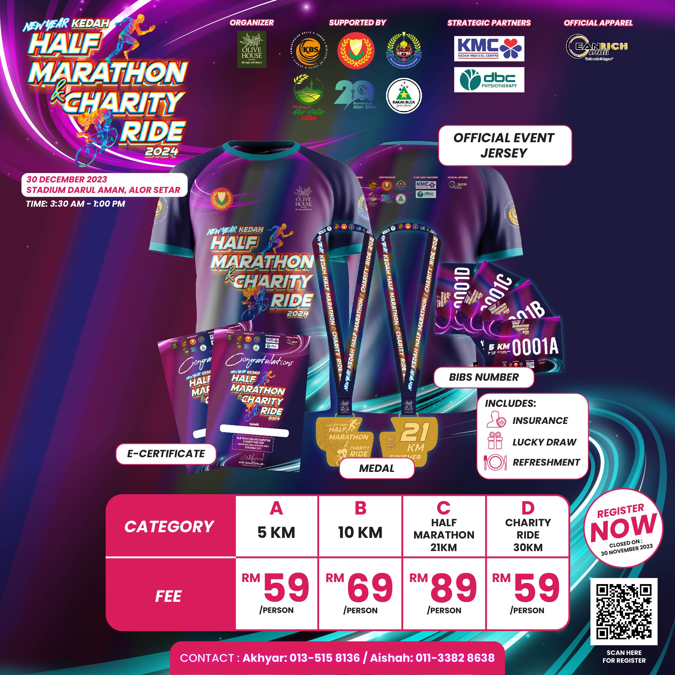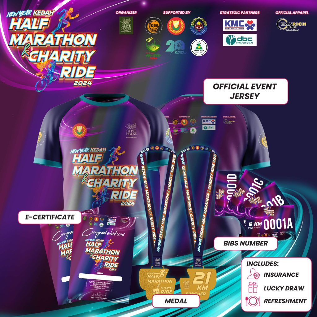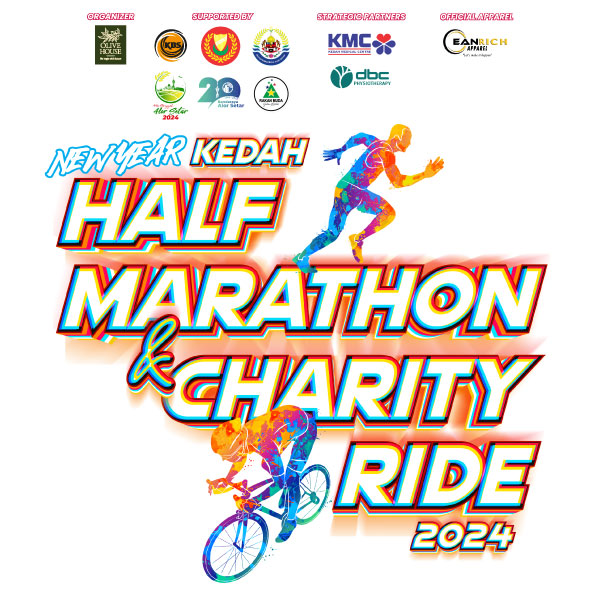 Jom sertai NEW YEAR KEDAH HALF MARATHON & CHARITY RIDE 2024 anjuran Olive House dengan kolaboratif Kerajaan Negeri Kedah, Kementerian Belia Dan Sukan Negeri Kedah, Majlis Bandaraya Alor Setar, Kelab Rakan Muda Negeri Kedah dan Kedah Medical Centre(KMC).