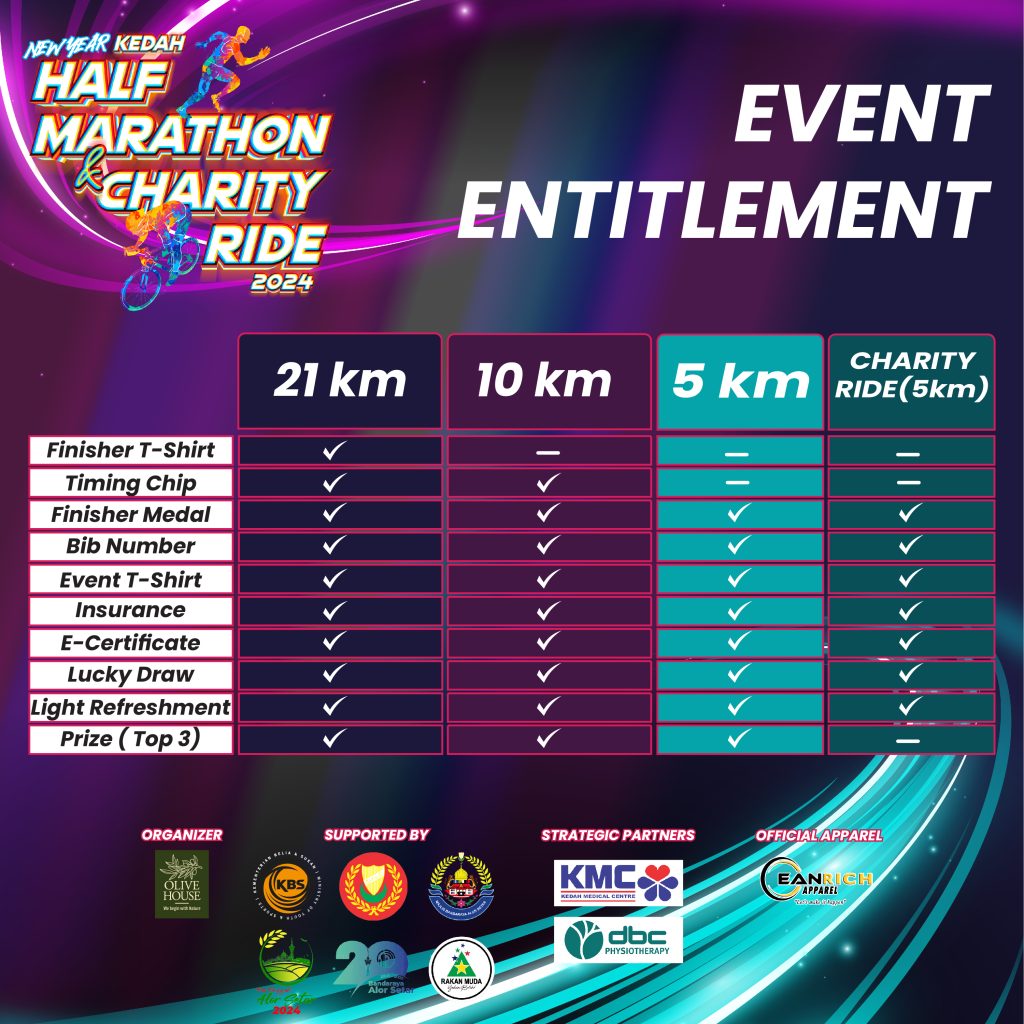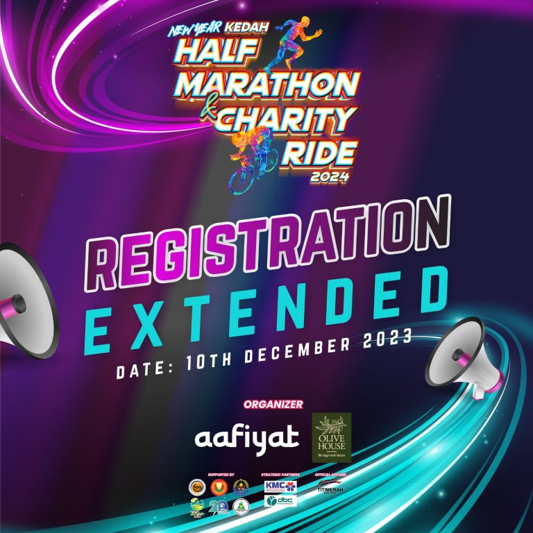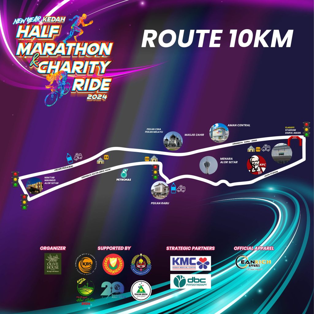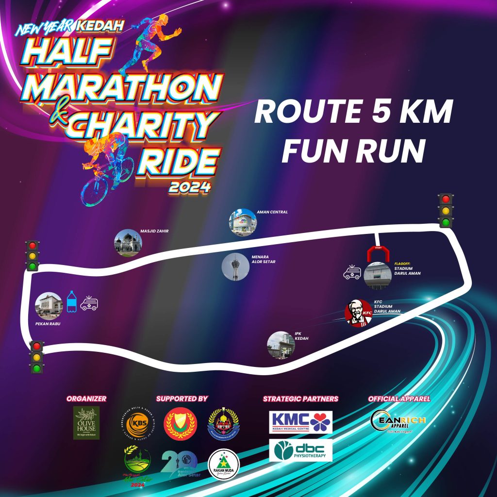 Jom sertai NEW YEAR KEDAH HALF MARATHON & CHARITY RIDE 2024 anjuran Olive House dengan kolaboratif Kerajaan Negeri Kedah, Kementerian Belia Dan Sukan Negeri Kedah, Majlis Bandaraya Alor Setar, Kelab Rakan Muda Negeri Kedah dan Kedah Medical Centre(KMC).