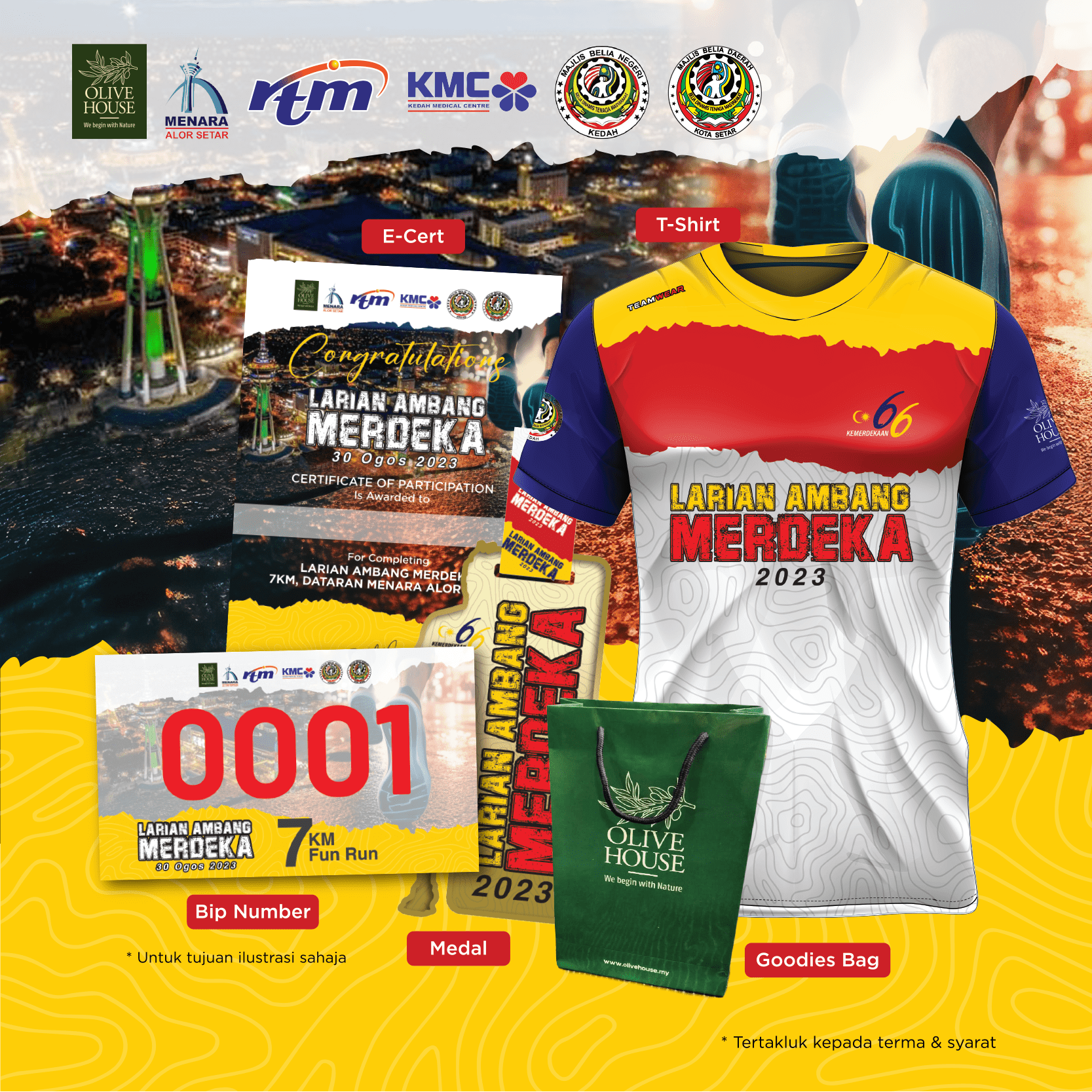 Dengan setiap penyertaan sebanyak RM 55, anda akan menerima T-shirt event, Medal, Bip Nombor, E-Certificate, Goodies Bag, Refreshment dan berpeluang untuk mendapat hadiah yang lumayan daripada cabutan bertuah.